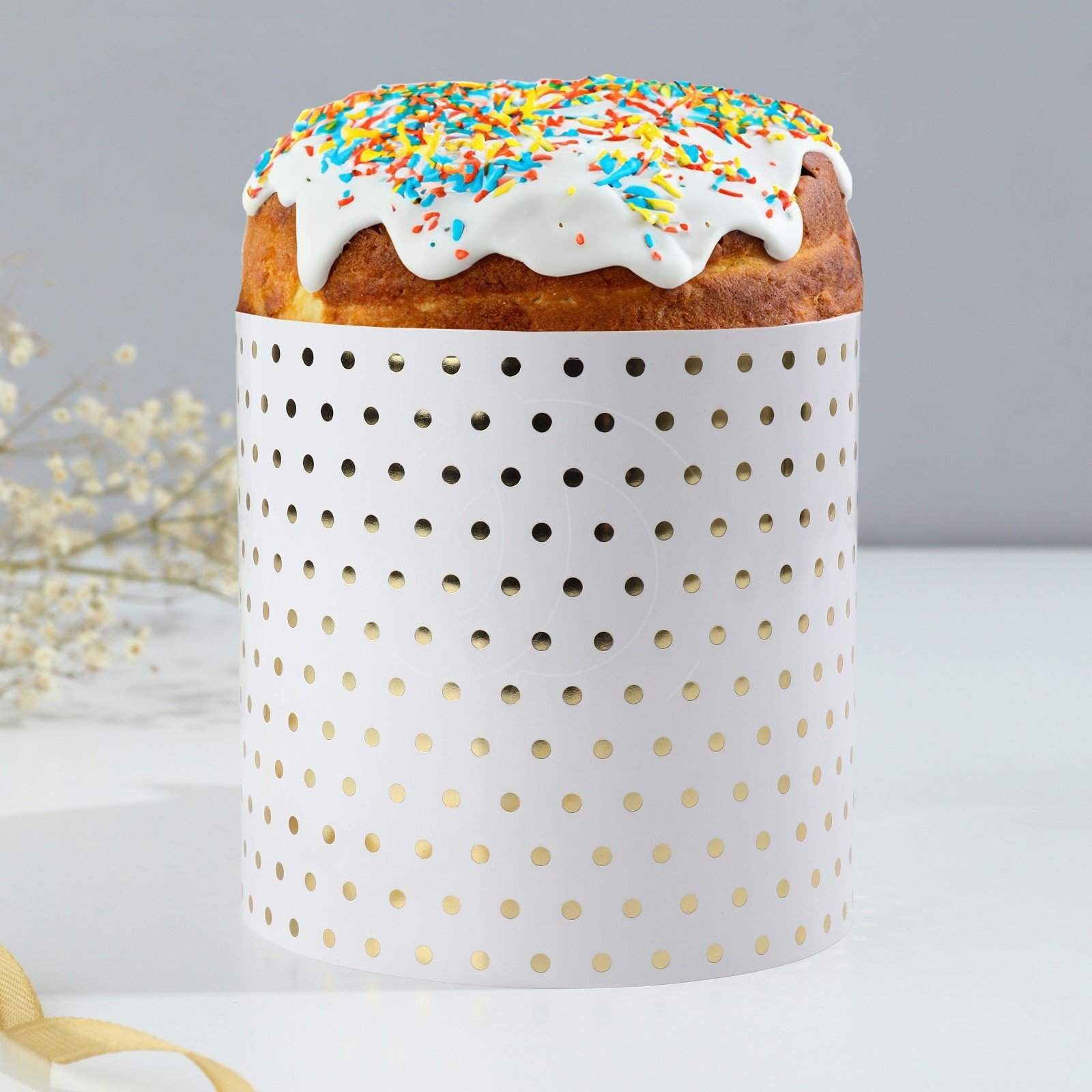 В такой яркой упаковке кулич будет торжественно смотреться на столе и выделяться на фоне всех остальных угощений.