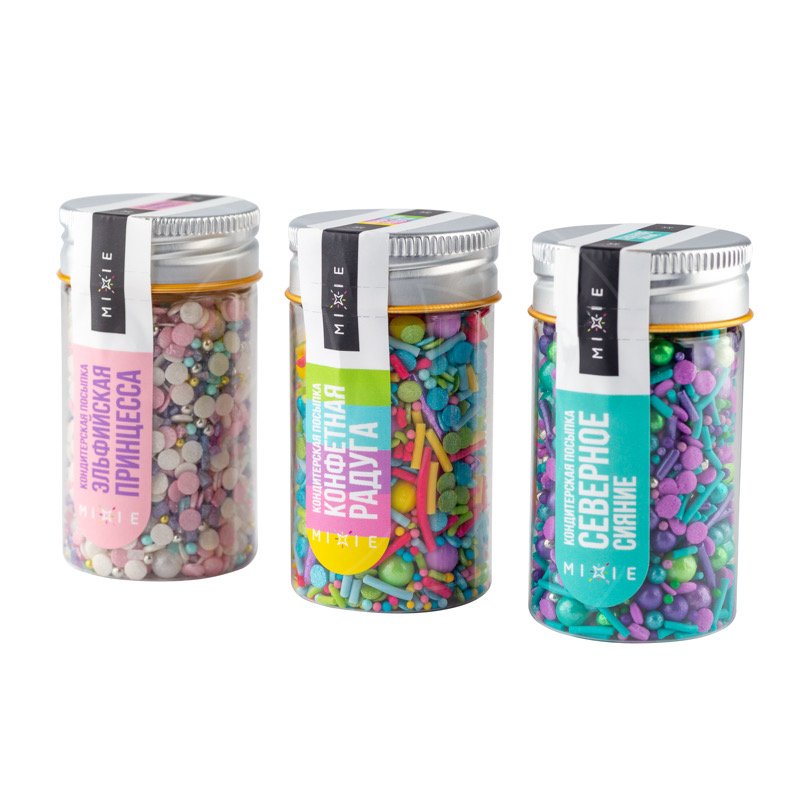 В наборе вы найдете посыпки: очаровательная “Эльфийская принцесса”, яркая “Конфетная радуга”, влекущее загадкой “Северное сияние”.