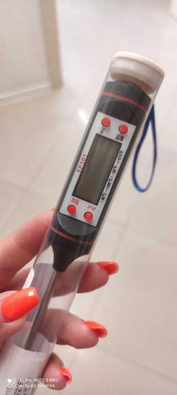 Очень нужная и полезная вещь на кухне и не только в кондитерском деле. Удобный длинный щуп позволяет измерять температуру на разной глубине и в разной посуде. Мыть термометр не нужно, достаточно просто протереть щуп влажной тряпочкой. Пользуюсь своим термометром уже больше года ни разу не подводил, рекомендую к покупке!